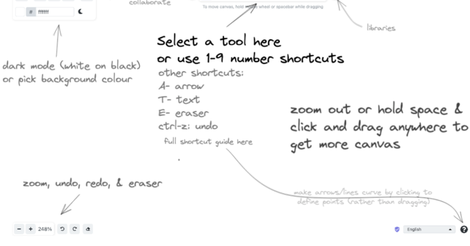 Excalidraw is a collaborative, shared whiteboard for typed text and sketching. Its key attractions are simplicity and easy collaboration. It’s designed for quickly creating simple graphics, and has a ‘sloppy/whiteboard’ style.