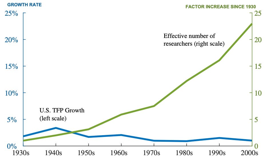 But without knowing the underlying kinetics of science and economic growth, this inertia model is just a guess. There are lots of other explanations which are consistent with the observation of diverging fuel use and acceleration. Our car could be going up a hill, or over a rough and rocky road. Or our engine could be depreciating or using the extra fuel inefficiently. Similarly, the ideas we produce might face growing barriers before they can materialize as physical products and buildings which affect productivity. Or our institutions of science are squandering the extra resources they receive with inefficient institutional designs.”