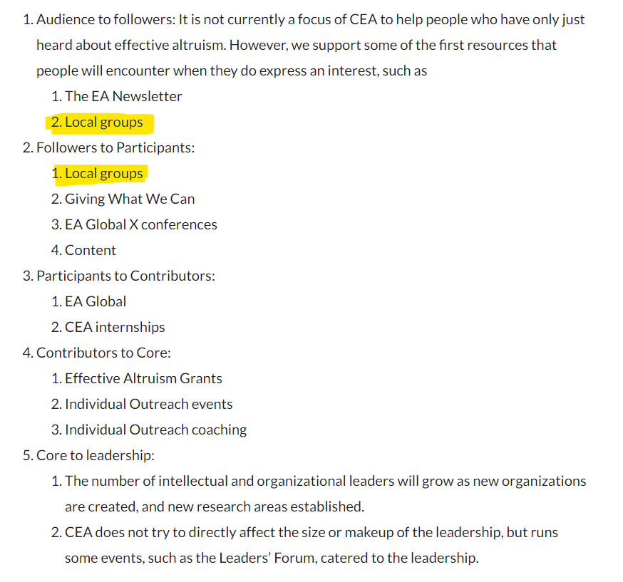 They mention local groups as working at the entrance to the funnel: moving people from audience to followers, and followers to participants.