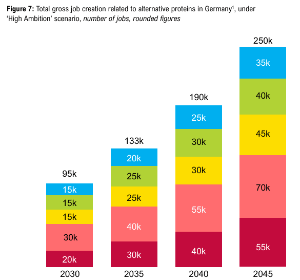 - This 2025 study in Germany found that, by 2045, the alternative protein industry could generate €65 billion and create up to 250,000 jobs in Germany by 2045. However, the authors note that this scenario would require political support to achieve.