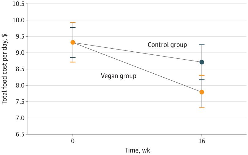 Thanks for this. I'm surprised how consistently the studies point in favor of vegan diets being cheaper on the whole (though I'll caveat none of these are too convincing: the headline RCT is testing a low-fat vegan diet instead of a general vegan diet and the rest are descriptive regressions / modeling exercises).