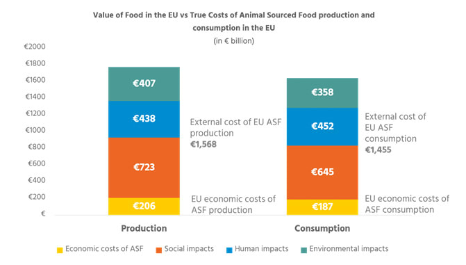 - This 2023 Eurogroup for Animals report found that the external costs of animal agriculture production and consumption totaled just over €3 trillion. The primary sources of the externalities were low animal welfare, diet-related disease, air pollution, and land use.