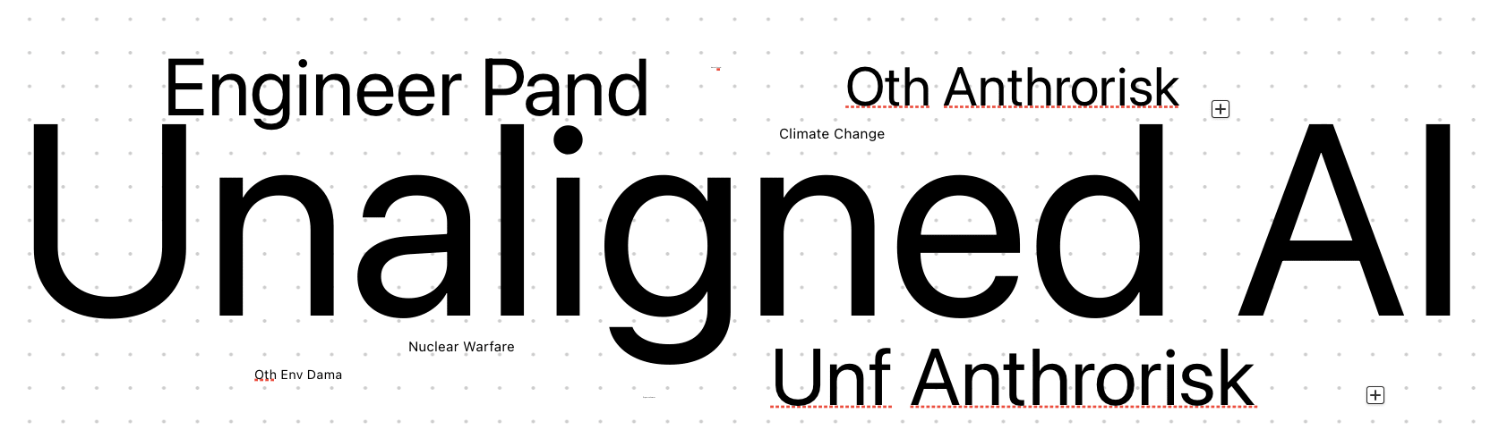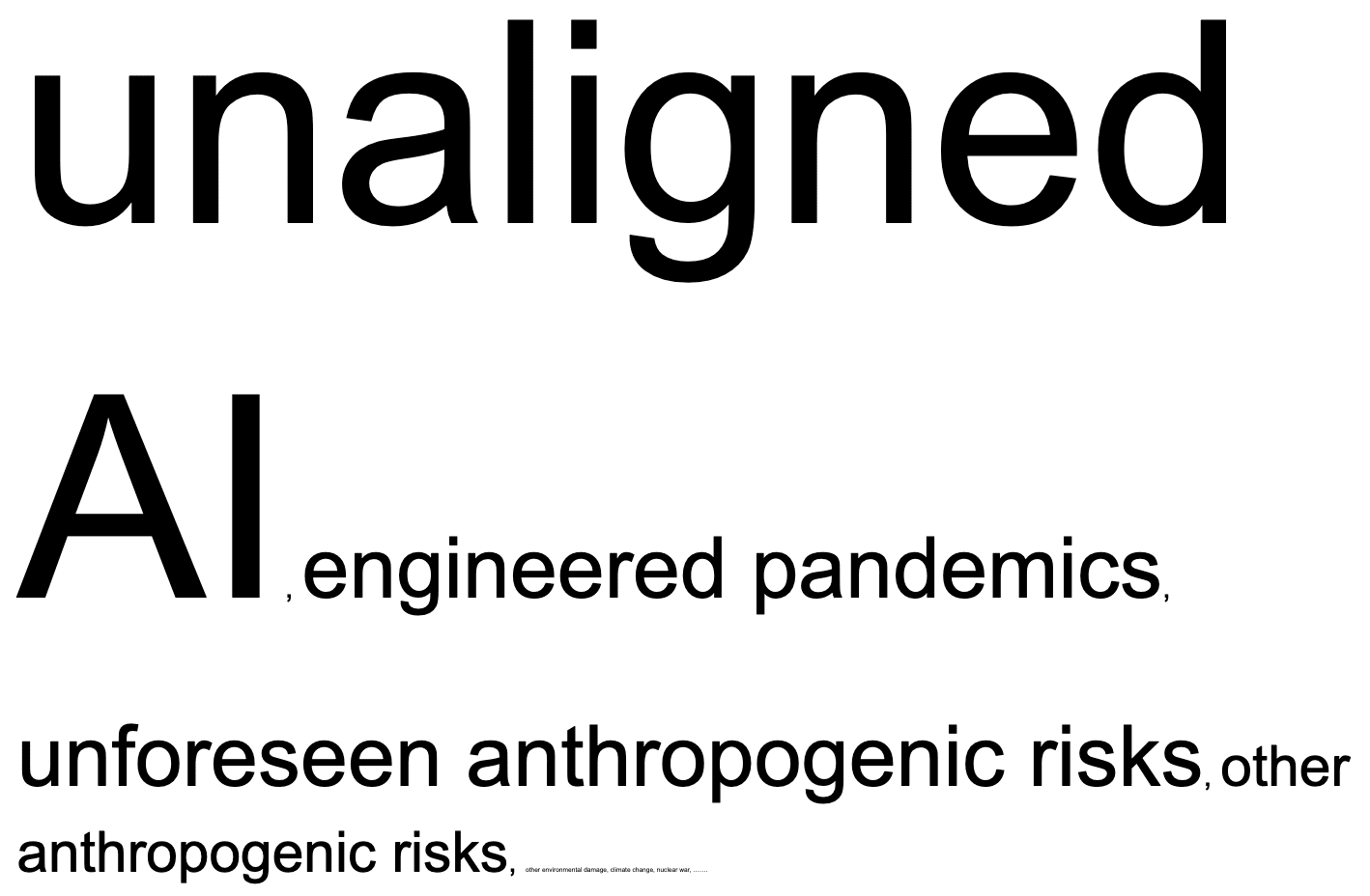 "Some existential risks include AI, Nuclear warfare, climate change, supervolcanos, cosmic events..." (see my bias in even how I remember and present these!)