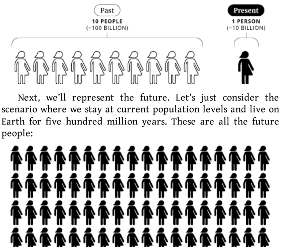 Rather similar infographic vibes as any of the to-scale cosmic scale portrayals, or this illustration from What We Owe the Future, I cut off the individual's legs at the bottom as an effective 'ellipses', since I didn't want to actually portray this (how hypocritical of me).