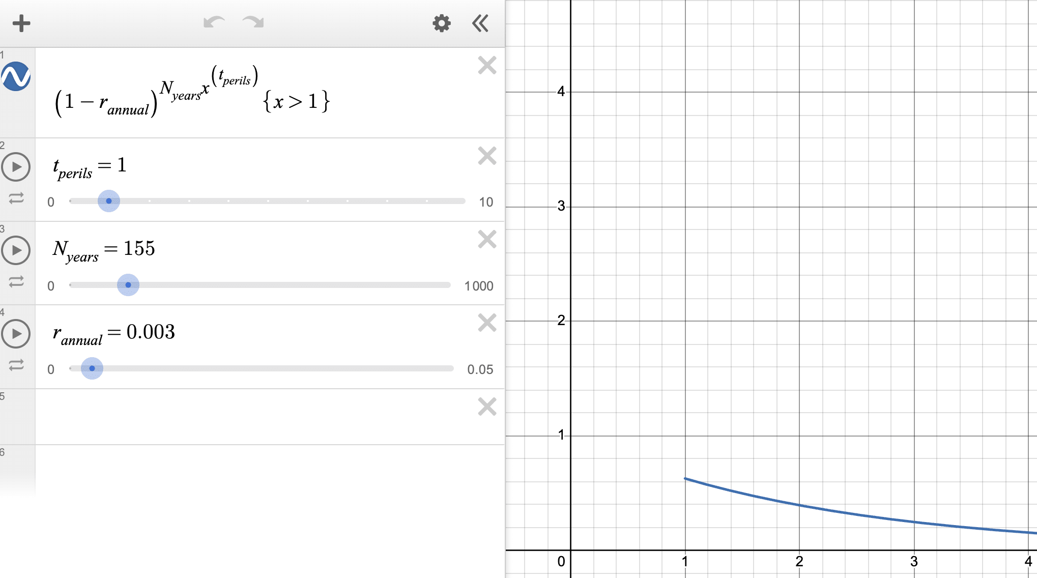 - r_annual is an approximately constant (or at least usefully averageable) annual risk of deploying civilisation-collapsing technology; and