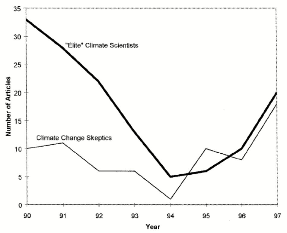 Figure 3: Number of Global Warming-Related Articles Citing one of five “Elite” Climate Scientists and/or one of five Climate Change Skeptics as an Information Source. Reprinted from McCright & Dunlap (2003).