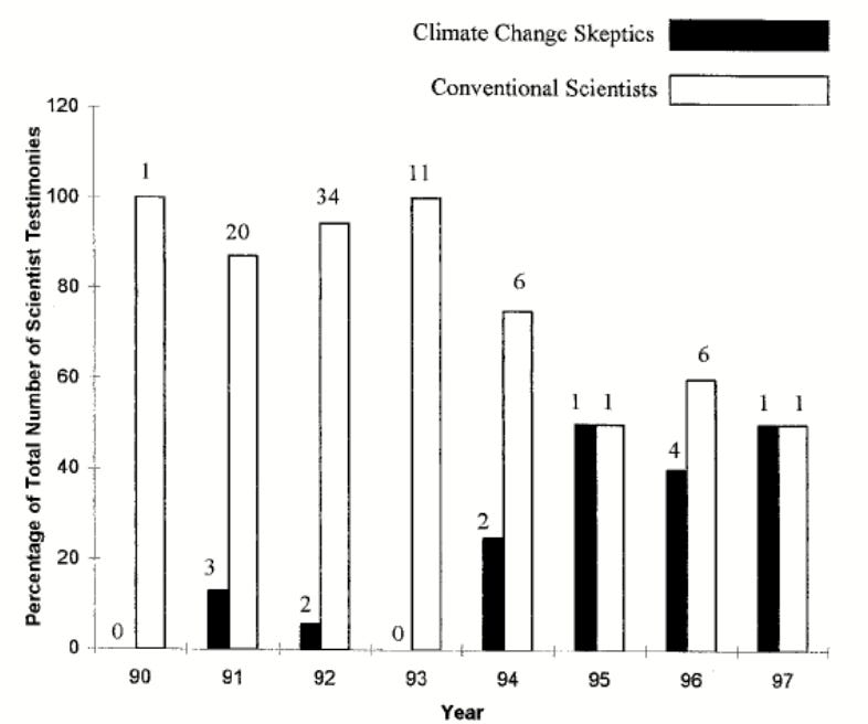Figure 2: Natural Scientists' Testimonies Delivered Each Year by Climate Change Skeptics and Conventional Scientists in Congressional Hearings About Global Warming. The vertical axis is the percentage of testimonies and the number of testimonies is printed above each column. Reprinted from McCright & Dunlap (2003).