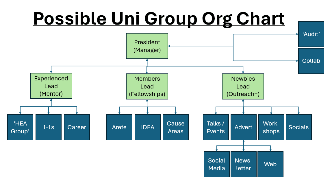 Executive summary: A proposed committee structure for larger EA university groups divides responsibilities into four main roles—President, HEA Lead, Fellowships/Groups Lead, and Outreach Lead—to balance skills, engagement levels, and leadership development while acknowledging potential challenges in execution.