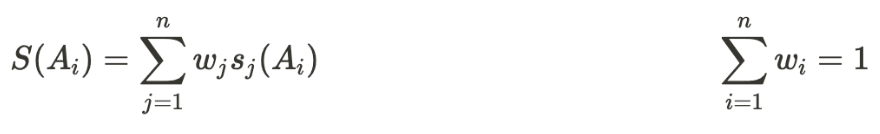 - The answer with the highest total alignment score S(Ai) is chosen as the final answer (by a very basic Judge). The greatest total alignment score over all Ai is referred to as Smax. For intermediate rounds, before all modifications have been taken, the total alignment score is denoted by Sk(ai) with Skmax defined similarly, where k denotes the specific round of modifications. In particular, Sn-1(ai) = S(Ai). S(Ai) is calculated as follows, where wj is the weight (credence) assigned to the jth theory in the Automated Parliament: