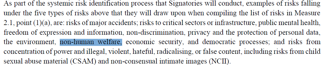 So during the EU AI Act Code of Practice consultations, Arturs and several other members coordinated on Hive (kudos to Keyvan, the Anima International team, and Adrià Moret). We decided to argue that animal welfare had been neglected in the EU AI legislative process, and that there was an opportunity to correct this by including animal welfare in the GPAI Code of Practice. Over 8 months, a small group of community members submitted consultations and attended working group meetings to eventually secure “non-human welfare” as a category of systemic risk to be assessed and mitigated. For more information on how the effort was organized, see Keyvan’s lightning talk about the EU AI Act CoP from the AI for Animals Bay Area 2025 Conference. The exact wording from the final EU AI Act CoP publication is shown below: