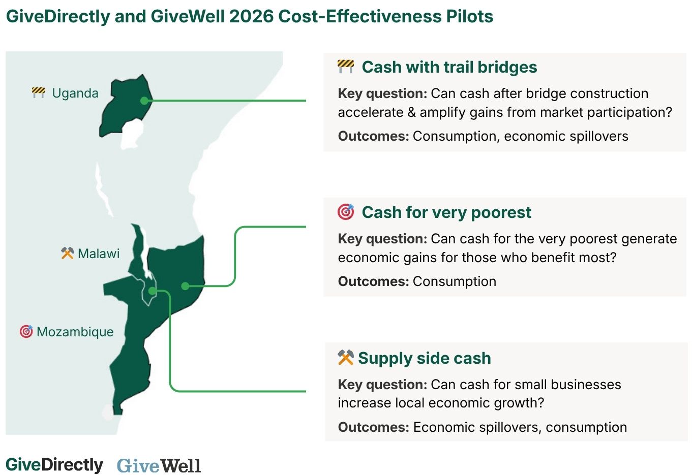 Today we’re asking: can we make our cash program even more cost-effective by increasing impact in these areas? With funding from GiveWell, we are running three pilots in 2026, each designed to test a specific hypothesis about how to increase total impact per dollar delivered.
