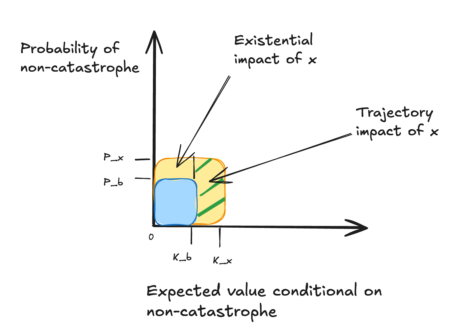 We call (Px – Pb) Kb the action’s existential impact and Px(Kx– Kb) the action’s trajectory impact. An action’s existential impact is the portion of its expected value (relative to baseline) that comes from changing the probability of existential catastrophe; an action’s trajectory impact is the portion of its expected value that comes from changing the value of the world conditional on no existential catastrophe occurring.