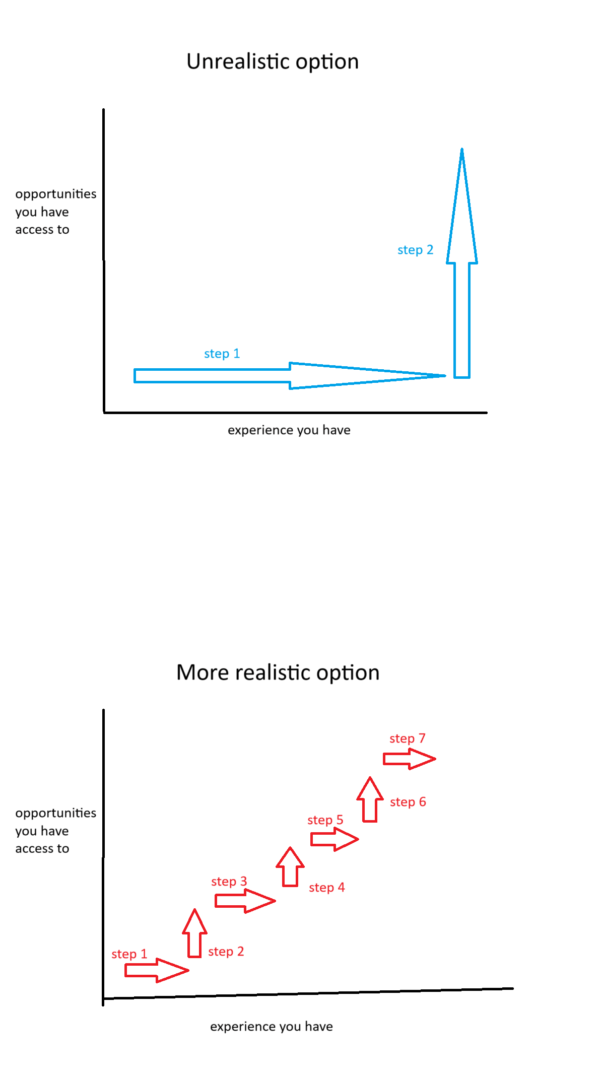 Finally, I want to argue that a large number of small steps are more realistic than a small number of big steps. Rather than getting some experience, then getting an impressive job, think of it like an incremental process in which you get a little experience, and then you get a low-quality job, and that job allows you to build your experience a little more, which allows you to get a slightly better job, etc. Here is my sloppy attempt at a visualization from MS Paint.