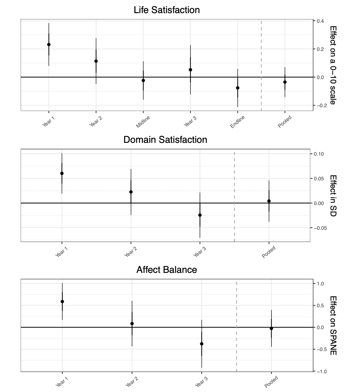 I've posted about it in more detail on social media (X / Bluesky), but I wanted to flag the new results on subjective well-being. Namely, these transfers - which represent 40% of baseline household income - have an effect on multiple different measures of well-being in year 1, but not in year 2 or 3.
