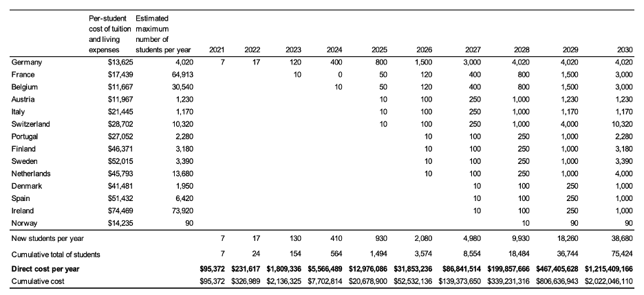 Malengo’s scaling timeline is shown in the table below. We sent 7 and 17 students to Germany in 2021 and 2022, and are in the process of sending 120 in 2023, as well as a pilot cohort of 10 students to France. In 2024, we plan to add Belgium, followed by Austria, Italy, and Switzerland (2025); Portugal, Finland, Sweden, Netherlands (2026); Denmark, Spain, Ireland (2027); and Norway (2028). We project that the number of students can grow by a factor of about 2.9 each year. At this rate, the program will reach 38,000 students per year by 2030, for a total financing volume of USD 4.3bn/year in direct costs.