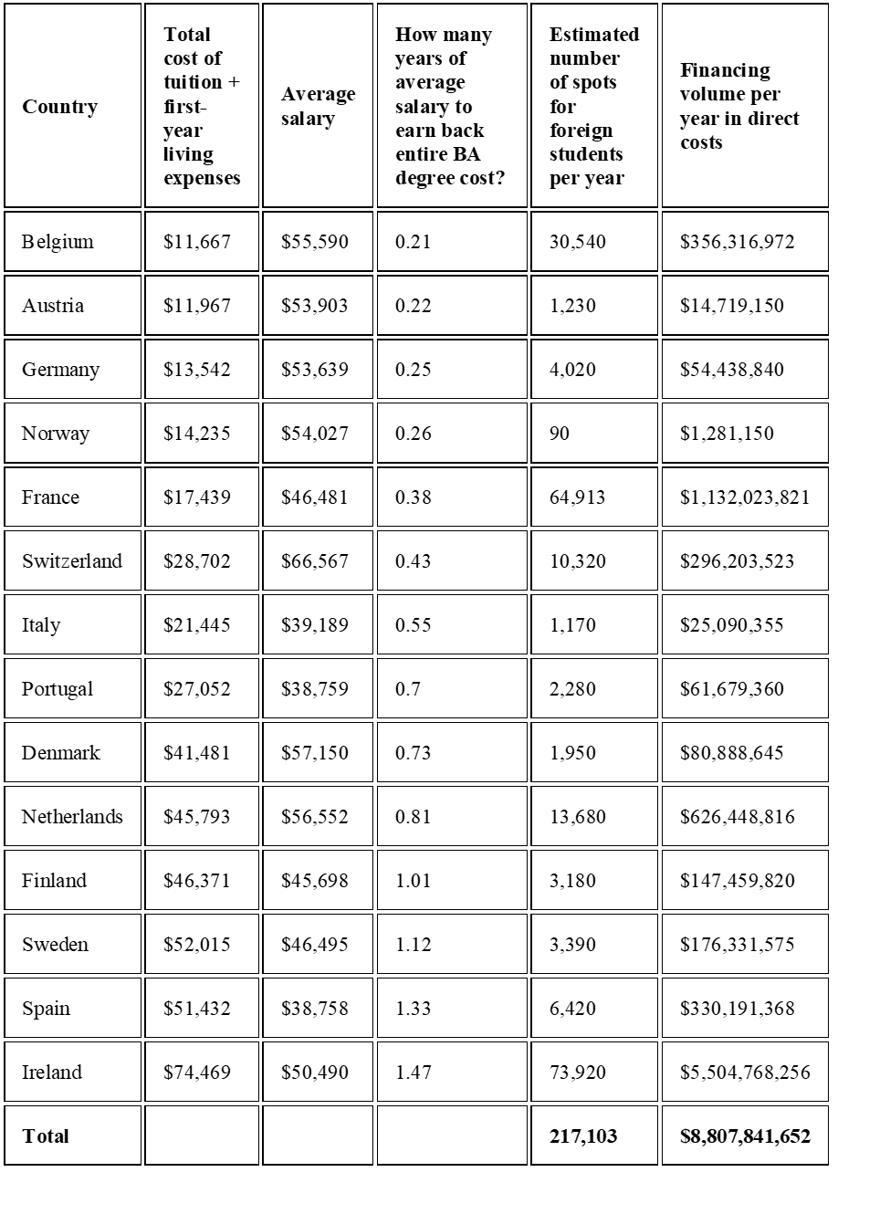 European undergraduate programs provide a unique opportunity for scholars from low-income countries because tuition is either free or heavily subsidized. (For those who fear that using these opportunities is “taking advantage” of the host countries, recall that the fiscal return to higher education is somewhere between 6–10%.) The table below provides an overview of study opportunities in 14 European countries, sorted by how long we estimate it takes to earn back the costs of tuition and first-year living expenses. (The motivation for this choice of cost is that after the first year students can typically support their living expenses through part-time jobs.)