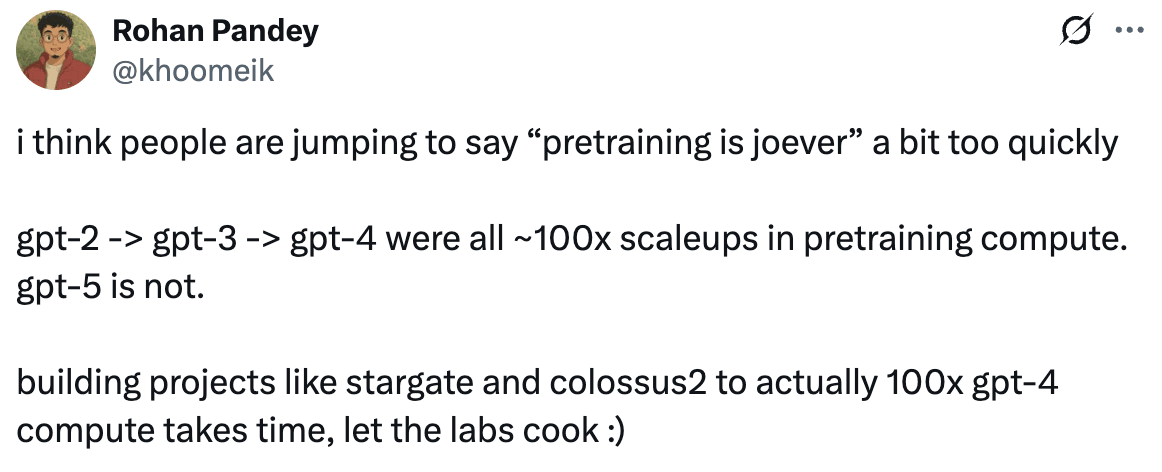 On compute, the big jumps have come from scale up in pre-training compute. GPT-3 → GPT-4 was roughly a hundred-fold; GPT-4 → 4.5 about an order of magnitude. Epoch think GPT-5 isn’t a major scale-up over 4.5, which also fits the lower cost and faster outputs. That doesn’t mean pre-training is over; it more likely the case that the next big scale up in pre-training will happen further down the line.