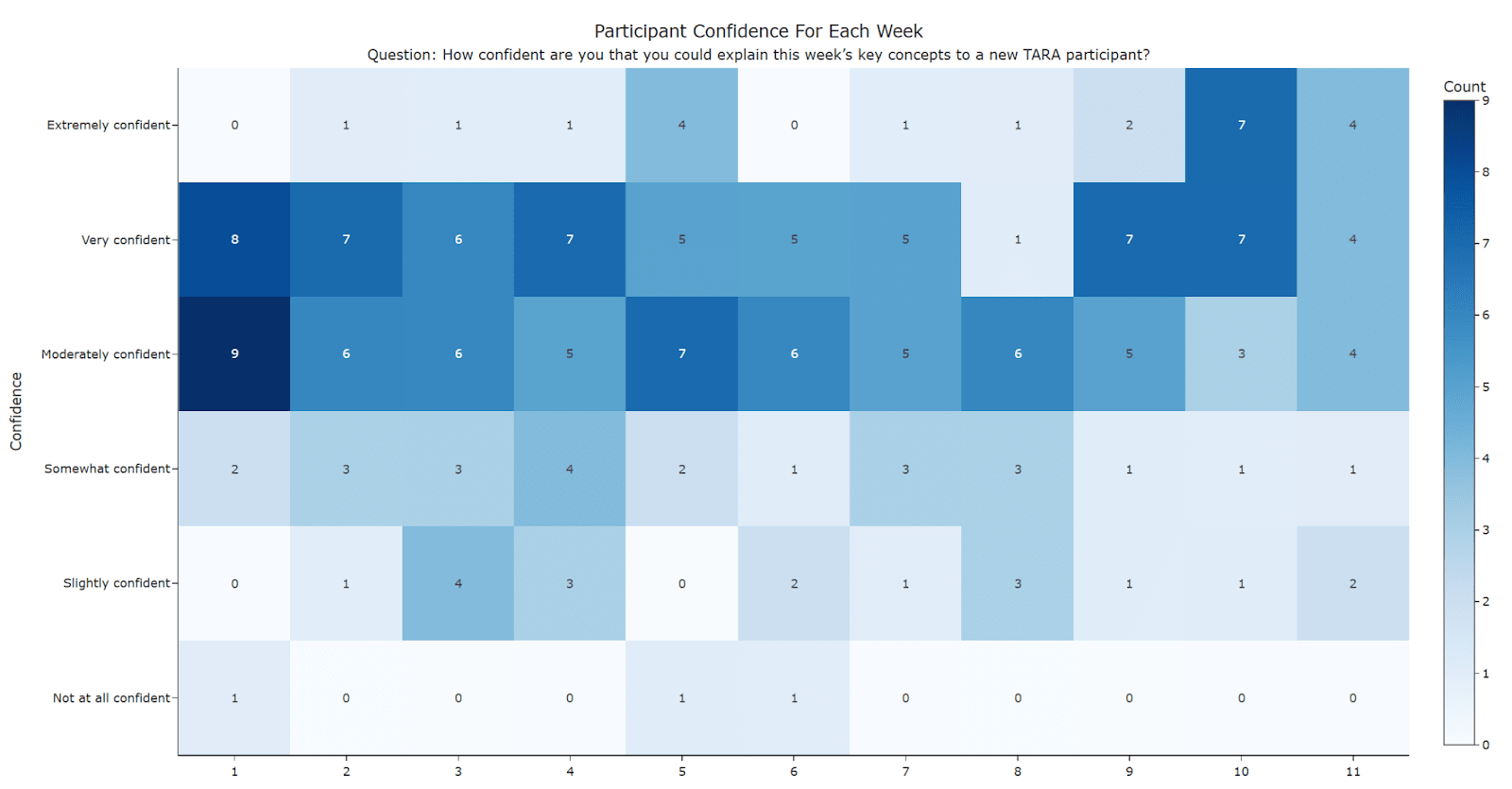 Each week, we surveyed TARA participants on how confident they were with the previous week’s material. We asked, “How confident are you that you could explain this week's key concepts to a new TARA participant?”