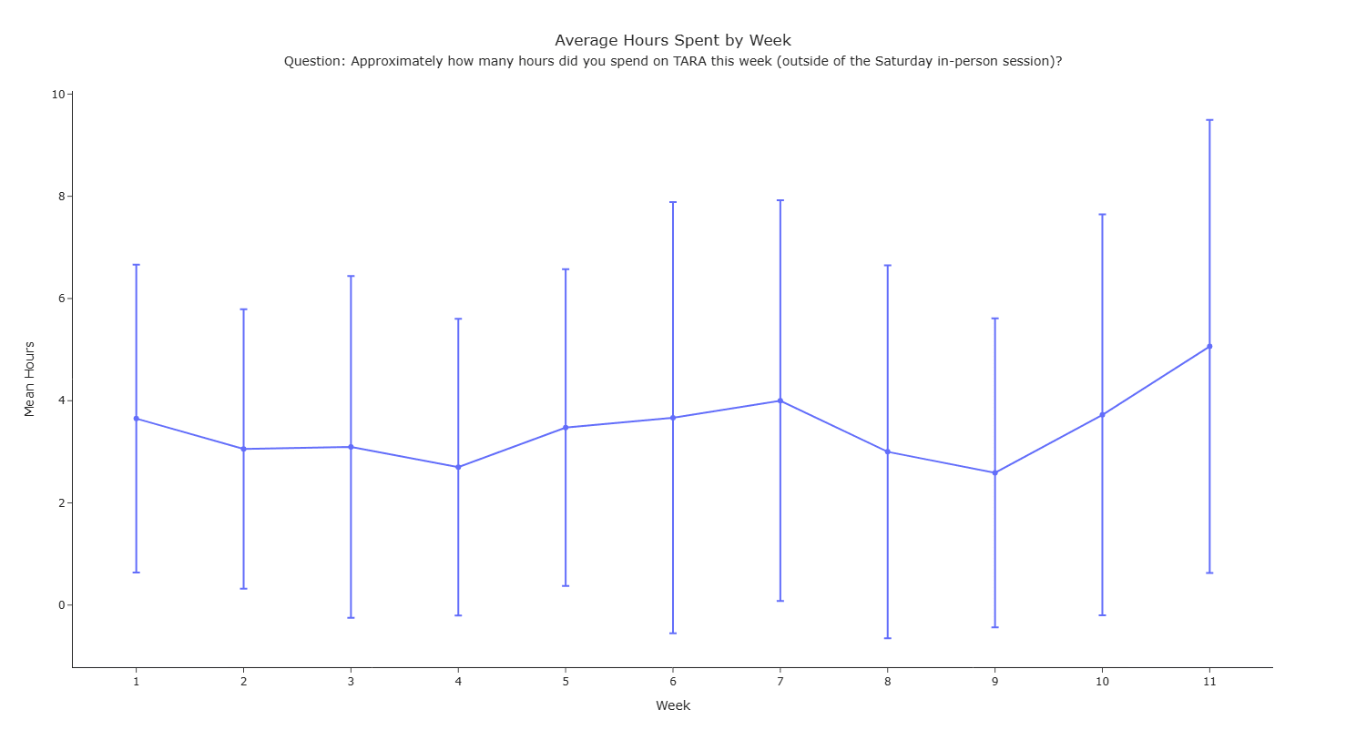 Outside of the Saturday sessions and during non-project weeks, participants spent an average of 3 hours 25 minutes per week studying, with this fluctuating across participants and the program.
