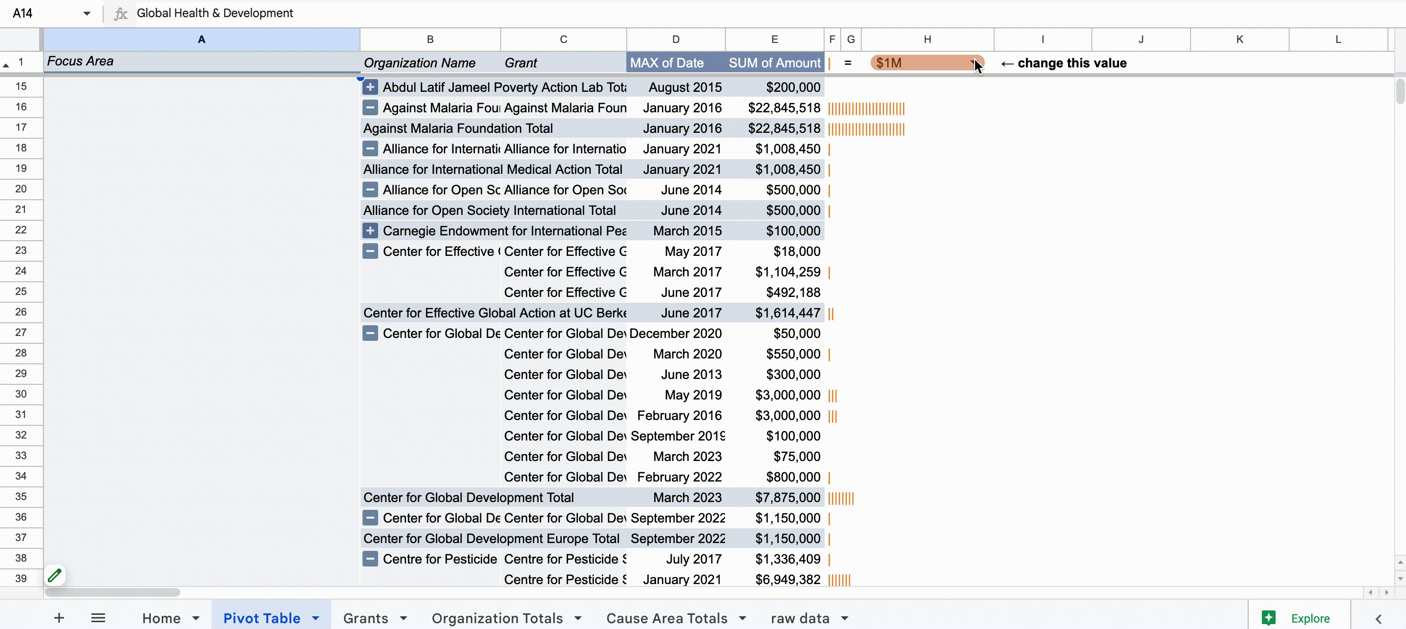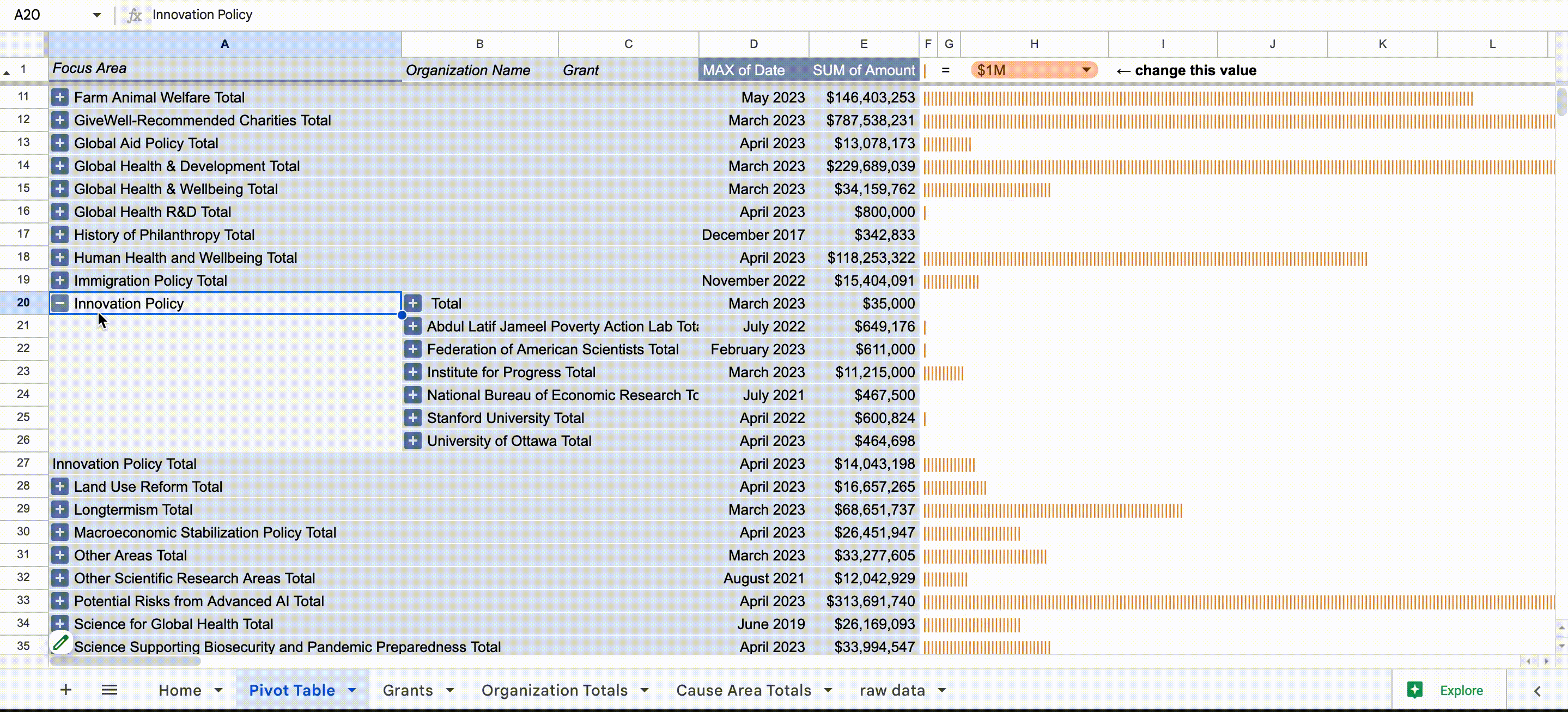 - Visualise all grant data in a pivot table that lets you expand/aggregate by Cause Area, then Organization Name, then individual grants