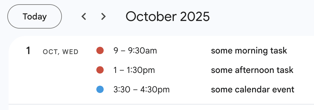 - Calendar events. As discussed above, a calendar event is not quite a task. These do get synced into todoist, so show up in the UI, but with ground truth in Google Calendar.