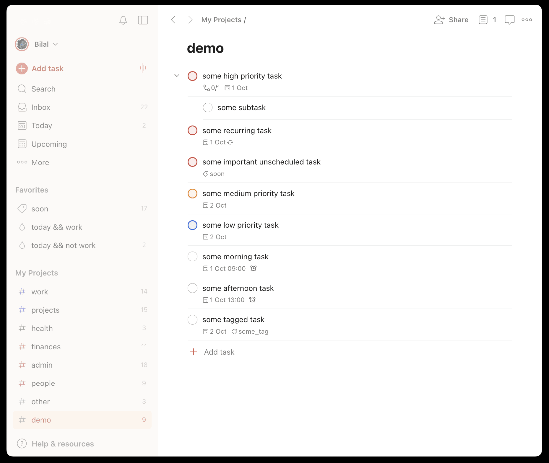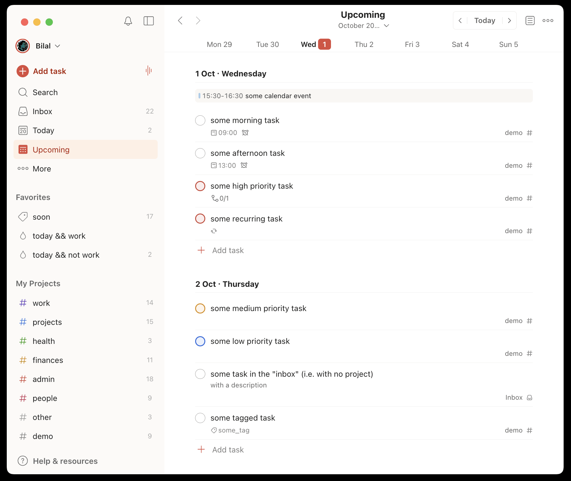Surfacing tasks and planning. The project view above is helpful for surfacing related tasks to get to when planning out a day. I then mostly plan my days by assigning the current date to tasks (via the natural language string "tod") and then staring at the "upcoming" view.