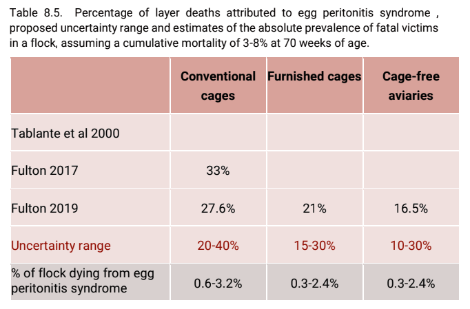 You can see their only data comes from two papers from Fulton, 2017 and 2019, done on US farms. The "confidence intervals" overlap, so the difference is not statistically significant. The estimates are further based on assuming a cumulative mortality, not direct estimates of it. And both of those papers themselves concluded that enriched cages were more humane than cage free aviary hens (AV), writing in the 2019 paper,