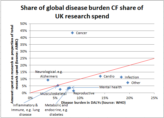 However I don't think it detracts from the conclusion about cancer -- it's still true that the UK allocates 43% of its research funding to cancer, whereas the only 9% of the global disability burden is for cancer.