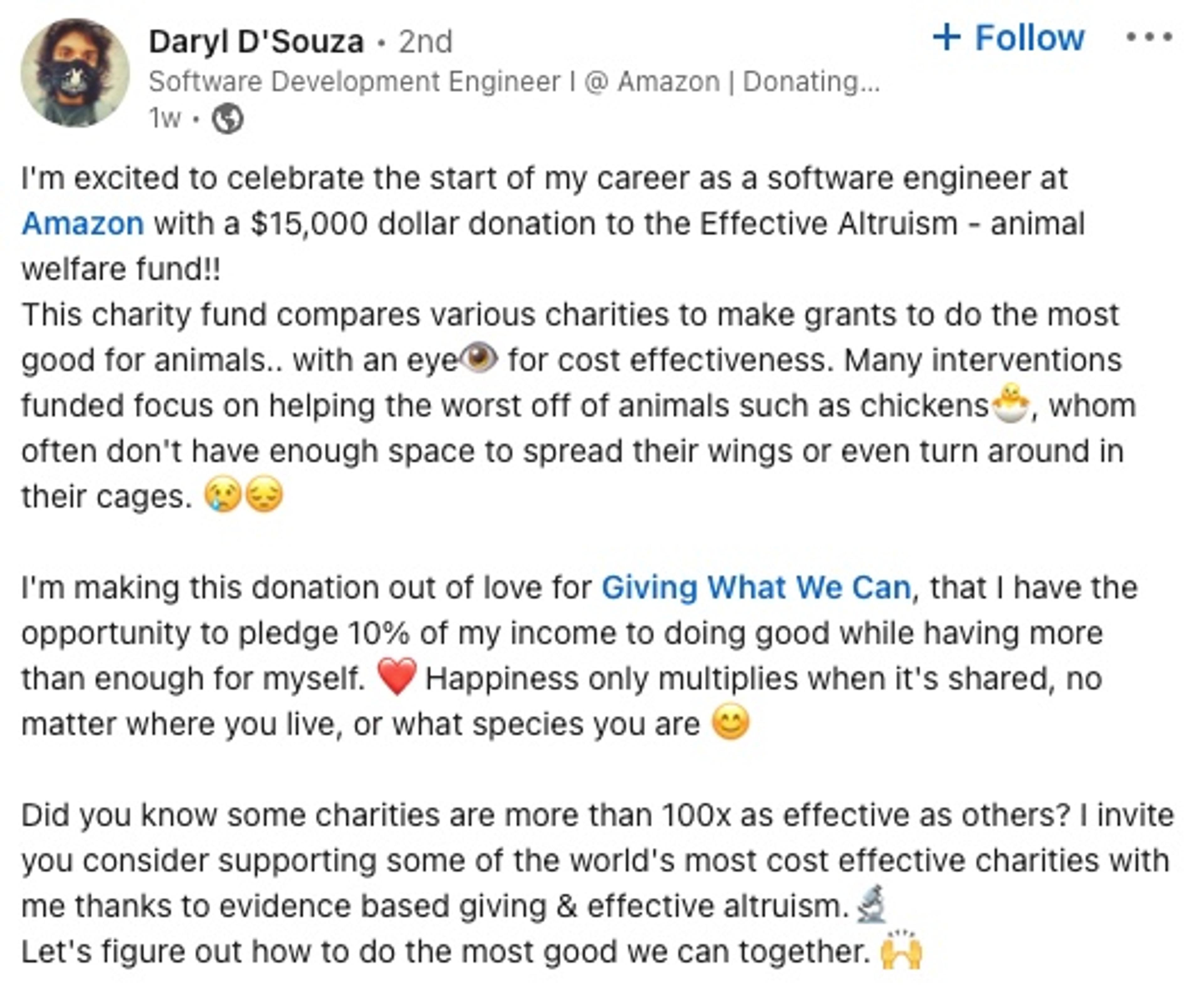 Member Daryl D'Souza started a new job and shared a donation publicly with his network!