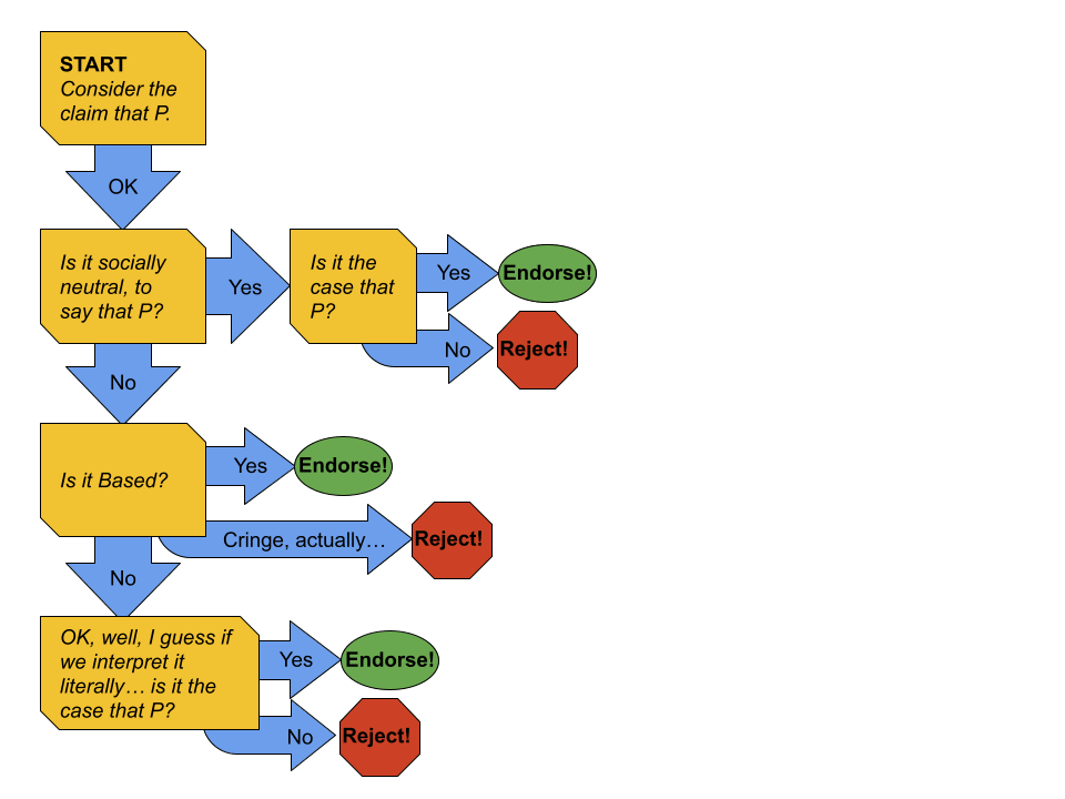 If for a particular claim you exit the flowchart in Row 2 or Row 4, you are at Simulacra Level 1. If you exit the flowchart in Row 3, you are in either Level 3 or Level 4 depending on how we define "cringe" and "based." (I'm tempted to say they are both Level 3, except there seems to be something inherently level 4-ish about "cringe" in particular.) Note that this flowchart leaves no possibility for Simulacra Level 2; congratulations for being so reliably honest!
