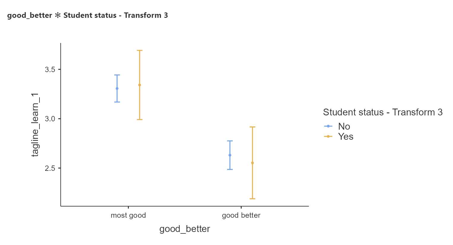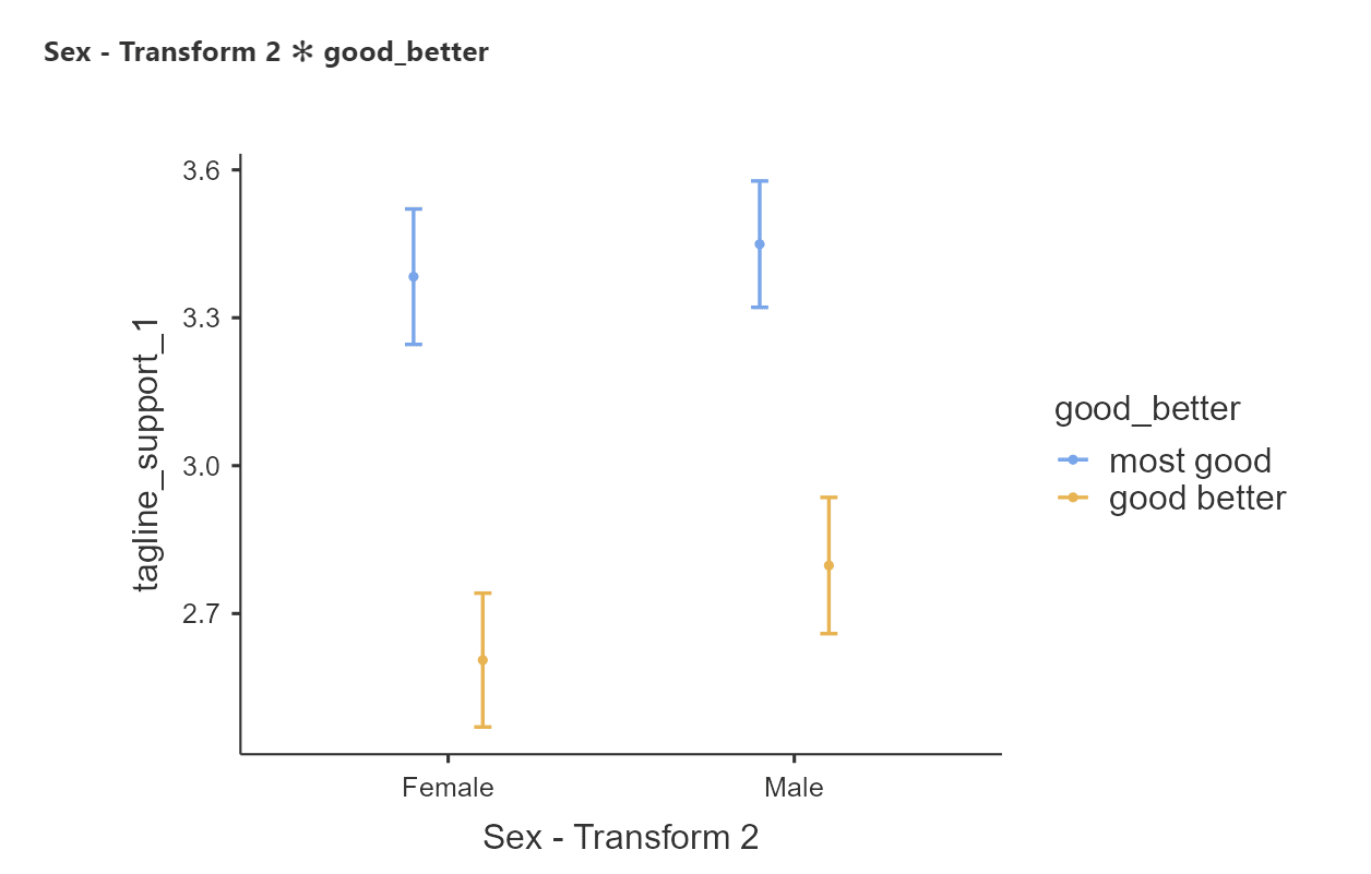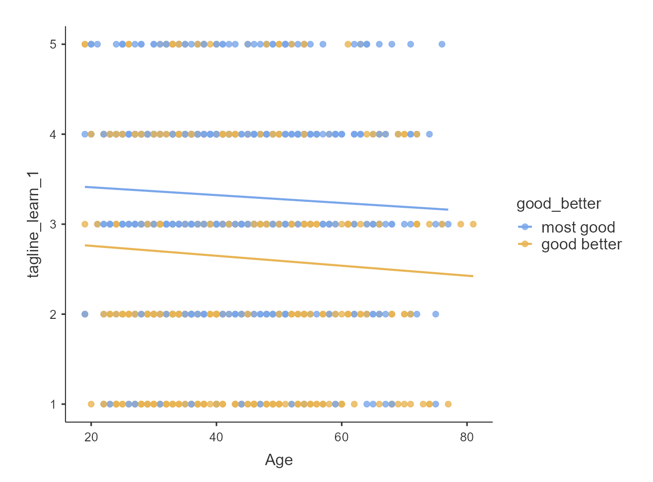 When looking for any interactions with demographics for these results, I found no significant demographic interactions, which is not uncommon. I focus here on the replication study in order to have a cleaner manipulation of the "doing good better" effect, though it's a smaller sample, and we gathered fewer demographics than in the representative sample in the first study.